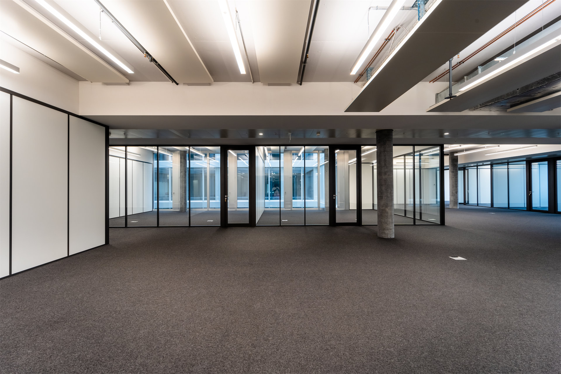 Les surfaces sont livrées techniquement équipées (faux planchers, plafonds actifs, éclairage intégré) et peuvent être personnalisées selon vos besoins.